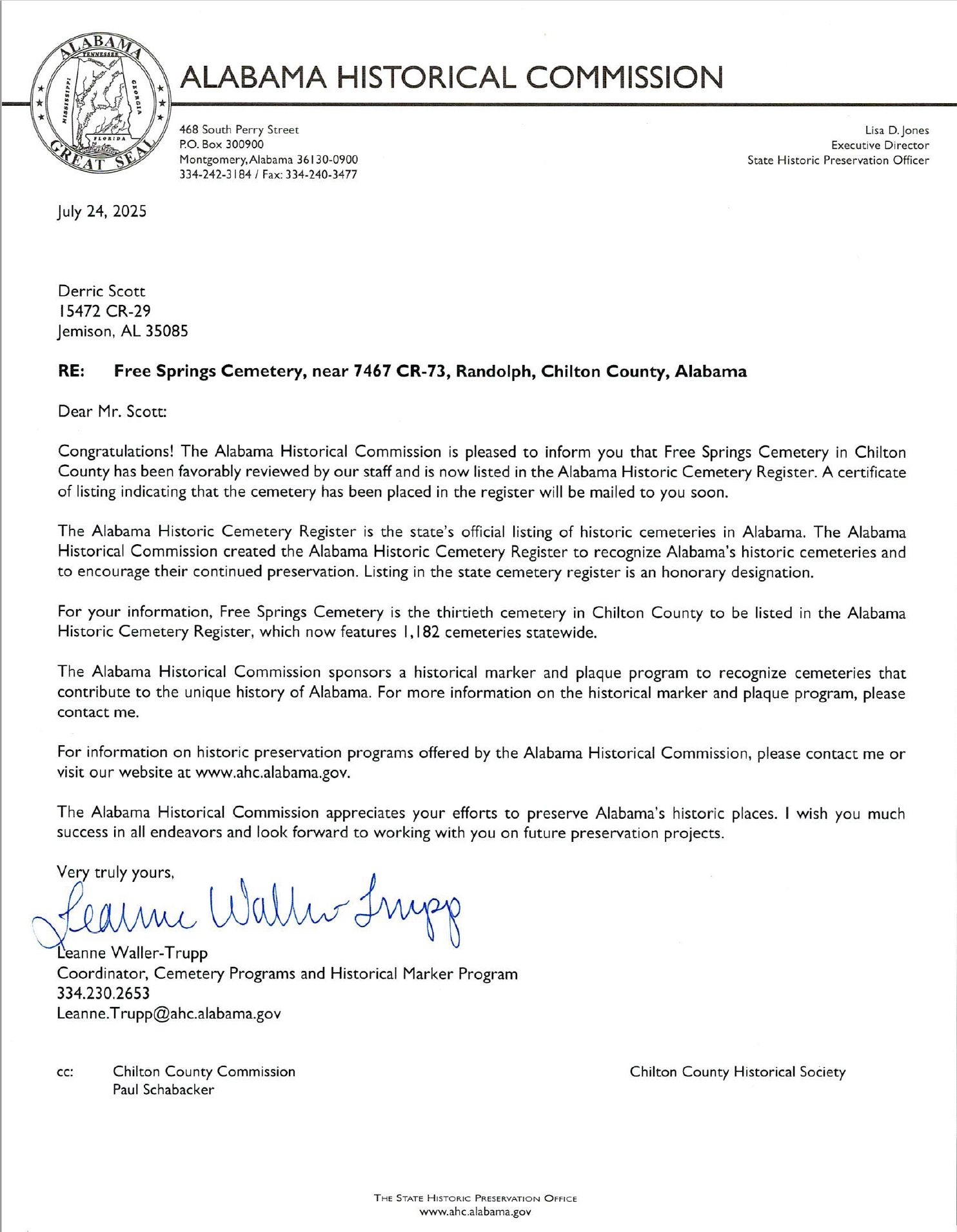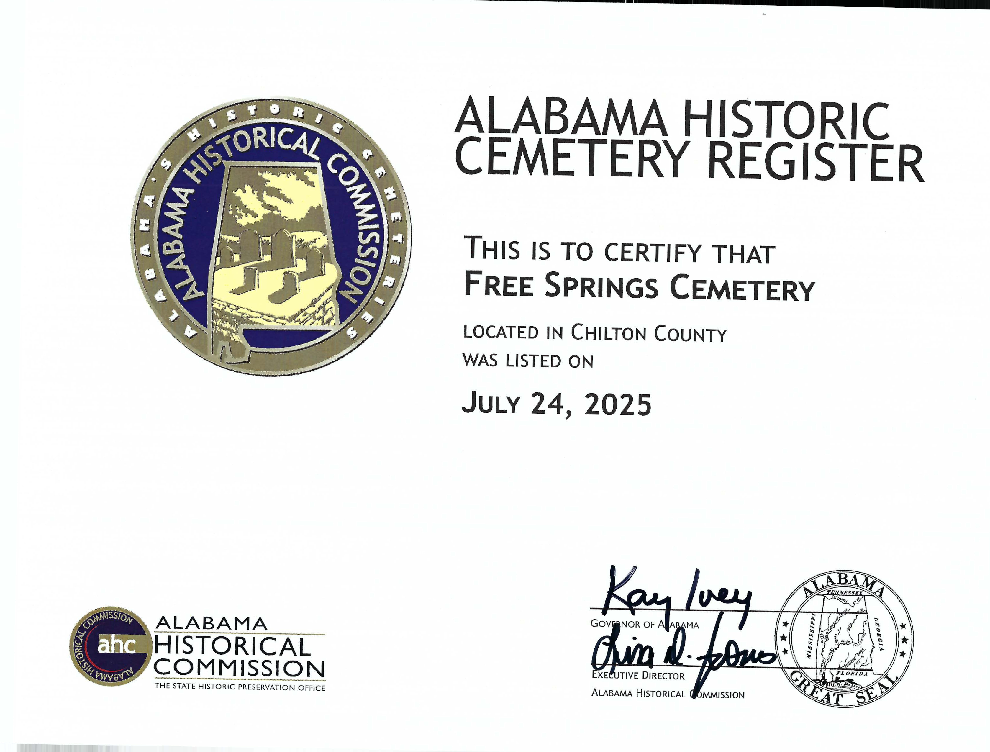 The Free Springs Cemetery was registered with the Alabama Historical Commission by Derric Scott.