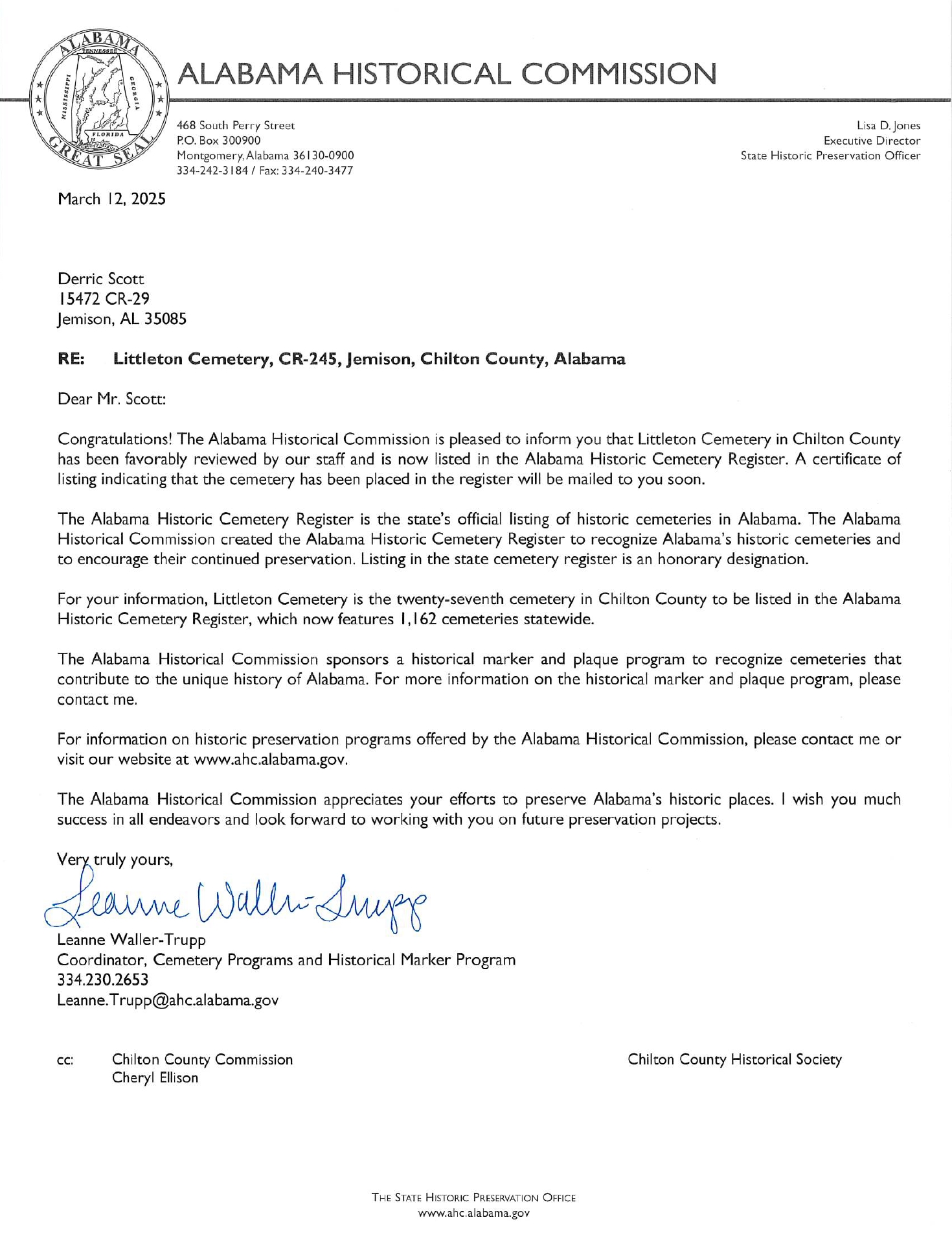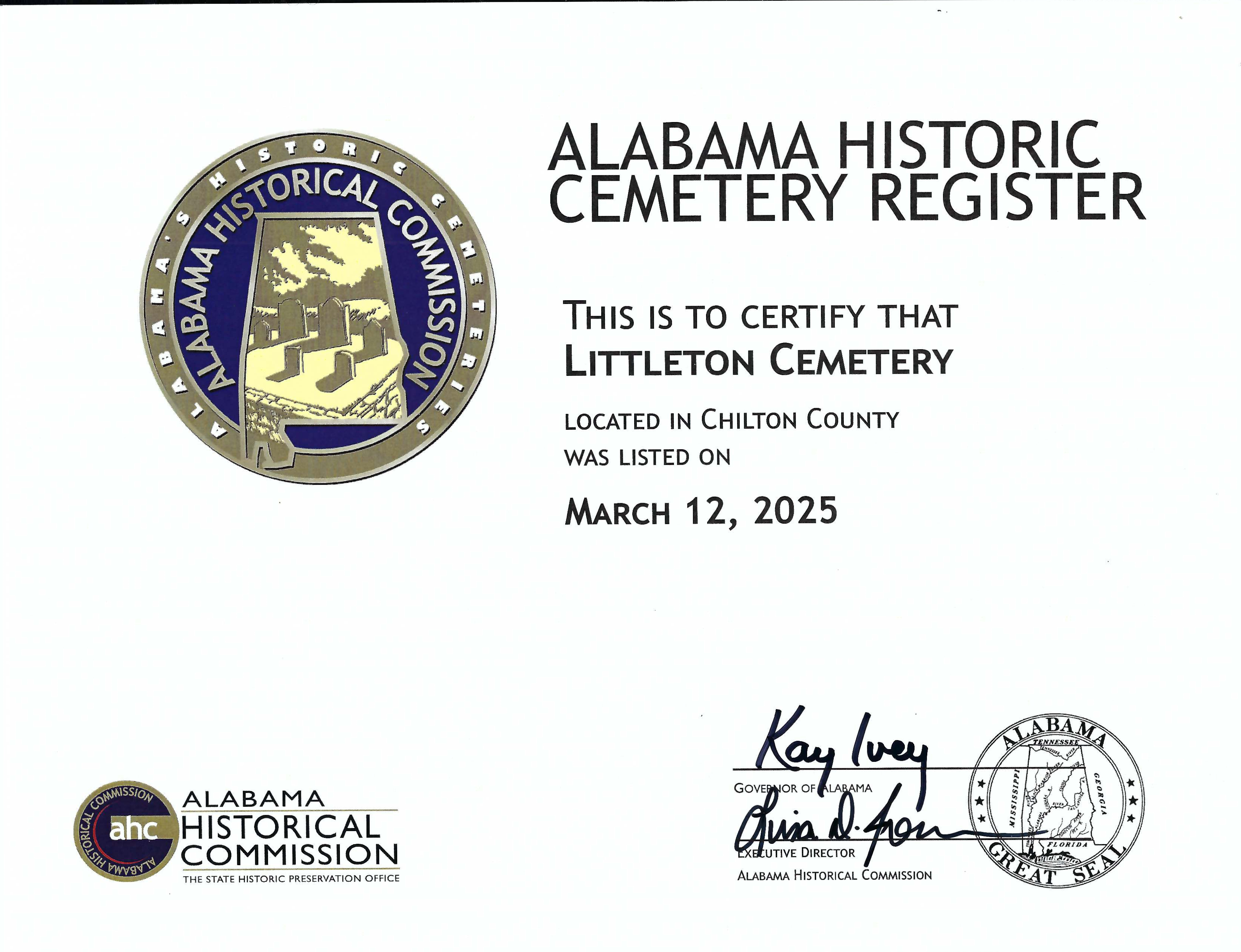 The Littleton Cemetery was registered with the Alabama Historical Commission by Derric Scott.