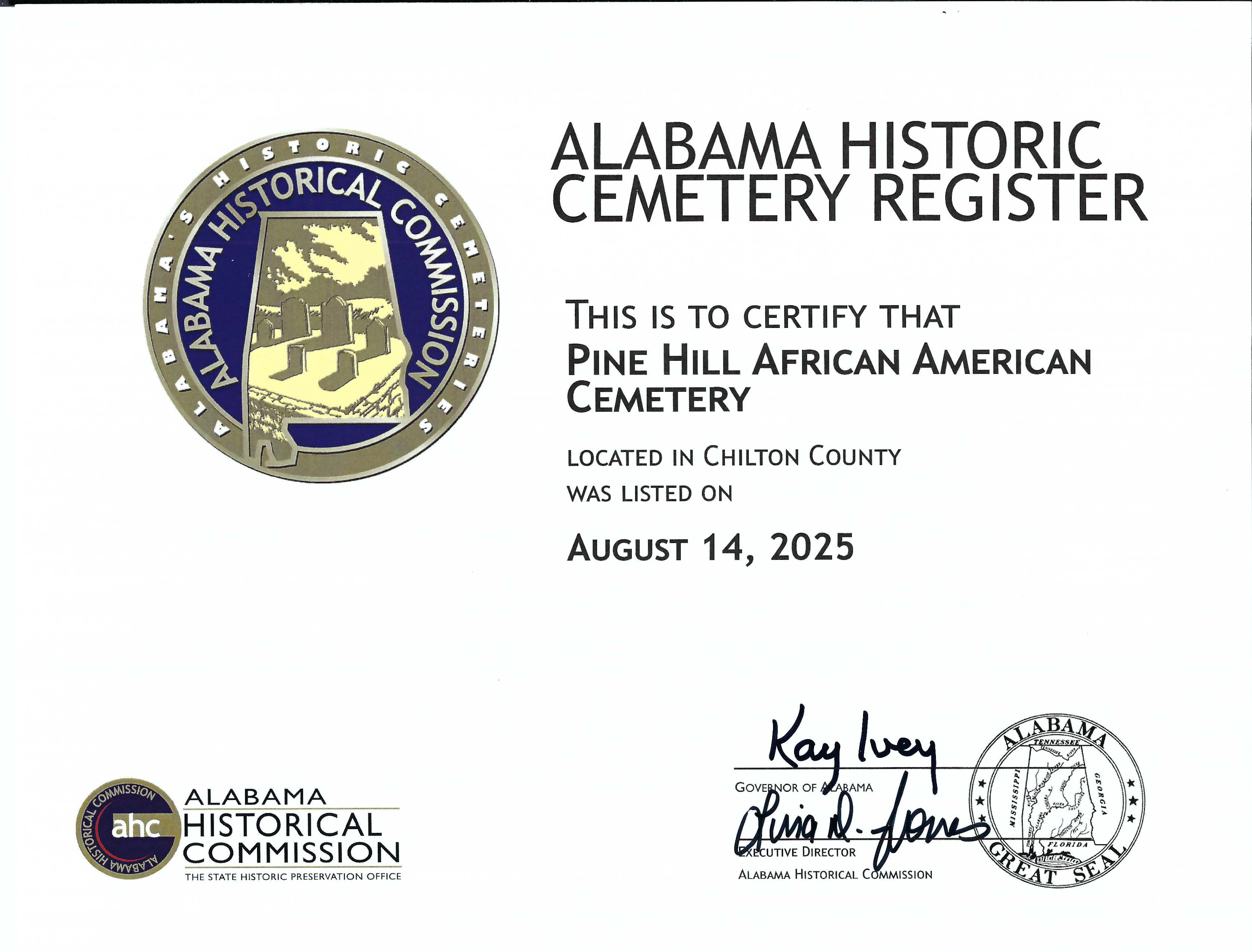 The Pine Hill African-American Cemetery was registered with the Alabama Historical Commission by Derric Scott.